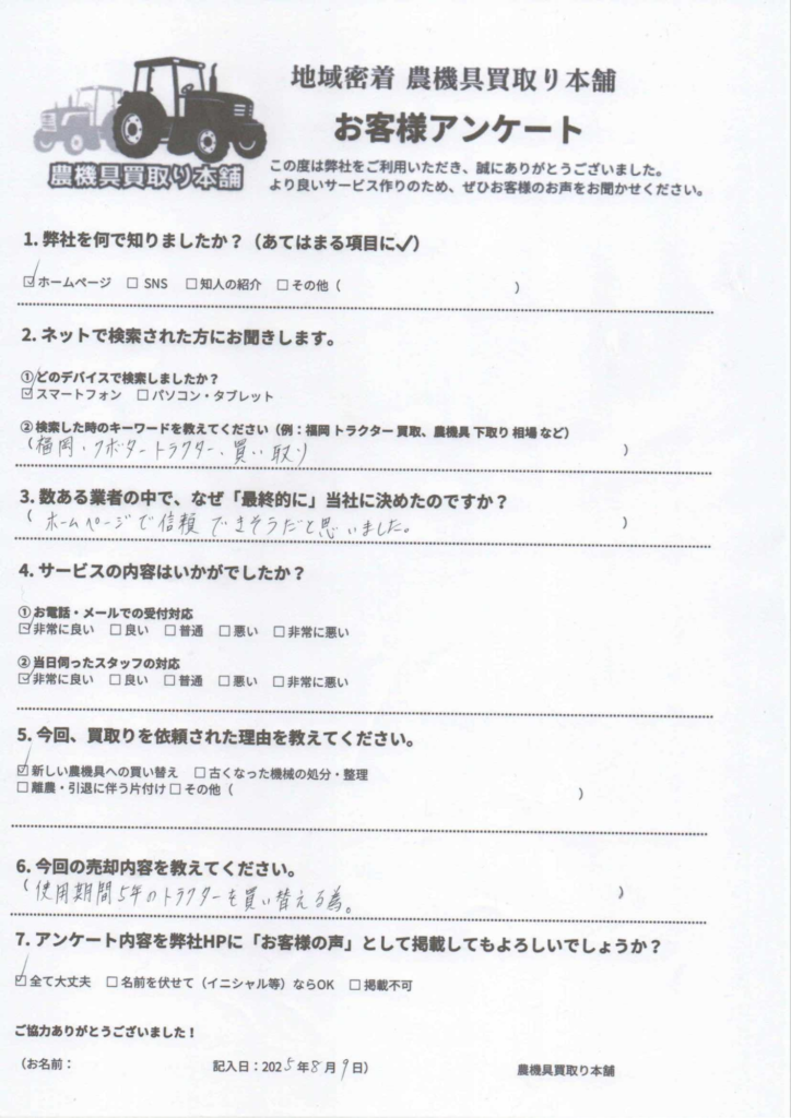 お客様の声: ホームページを見て、ここなら信頼できそうだ」と感じたのが、最終的に決めた理由です 。お電話での受付から当日のスタッフの対応まで、すべてにおいて「非常に良い」と満足しています 。今回は使用期間5年のトラクターからの買い替えでしたが、安心してお任せすることができました 。