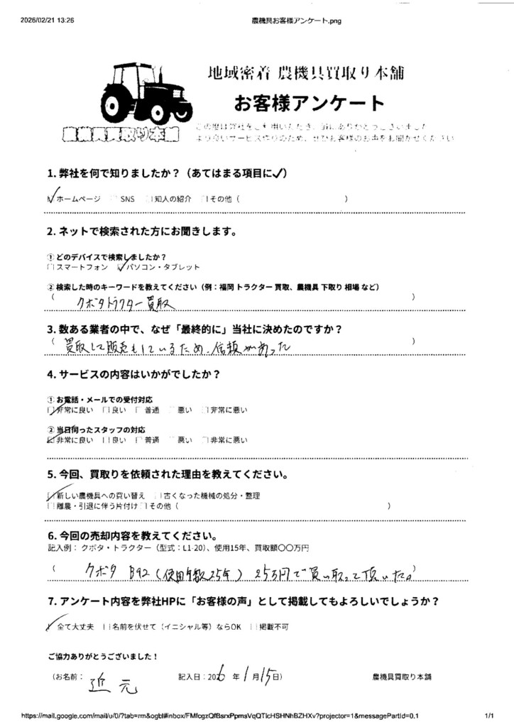 近元さま、この度は大切なトラクターの買取りをお任せいただき、誠にありがとうございました。