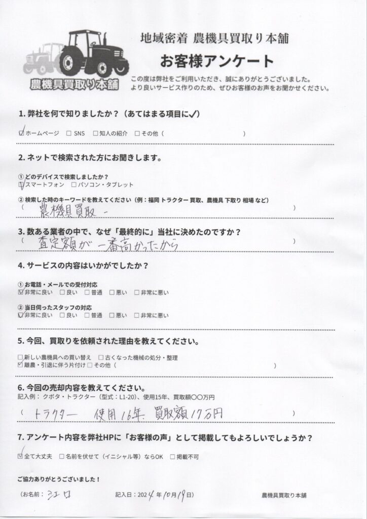 今回は離農に伴う片付けとして、16年使用したトラクターをお願いしましたが、17万円という納得のいく金額で買い取っていただけて良かったです。